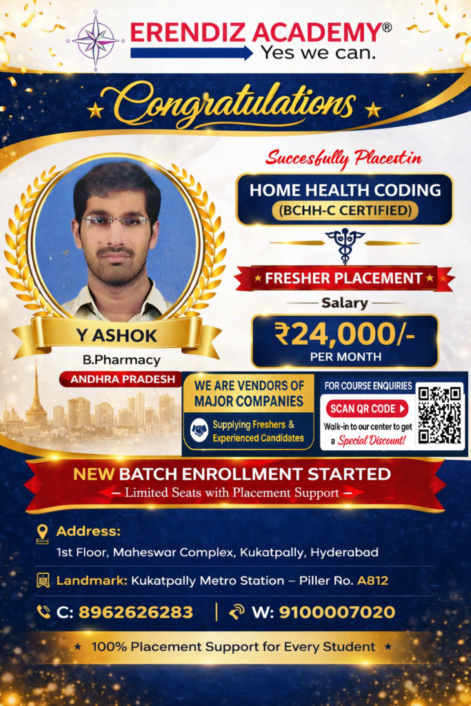 I highly recommend "Erendiz Academy" to anyone looking to improve or achieve goal in Medical coding. The Vasu sir's teaching methods were clear, engaging, and helped you understand the material (Effective teaching methods, helpful staff, and a conducive learning environment with 100% placement)."special thanks to Erendiz Academy "